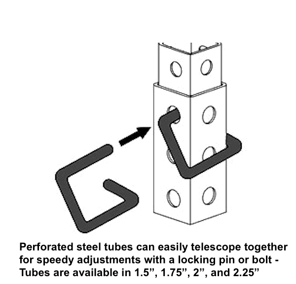Perforated tube has 7/16" diameter holes on 1" centers on all four sides of the tube. The 1-3/4 x 1-3/4 x 12 perforated tube is designed to be telescoped into our 2 x 2 x 12 ga perforated tube and can be used with our locking pins.